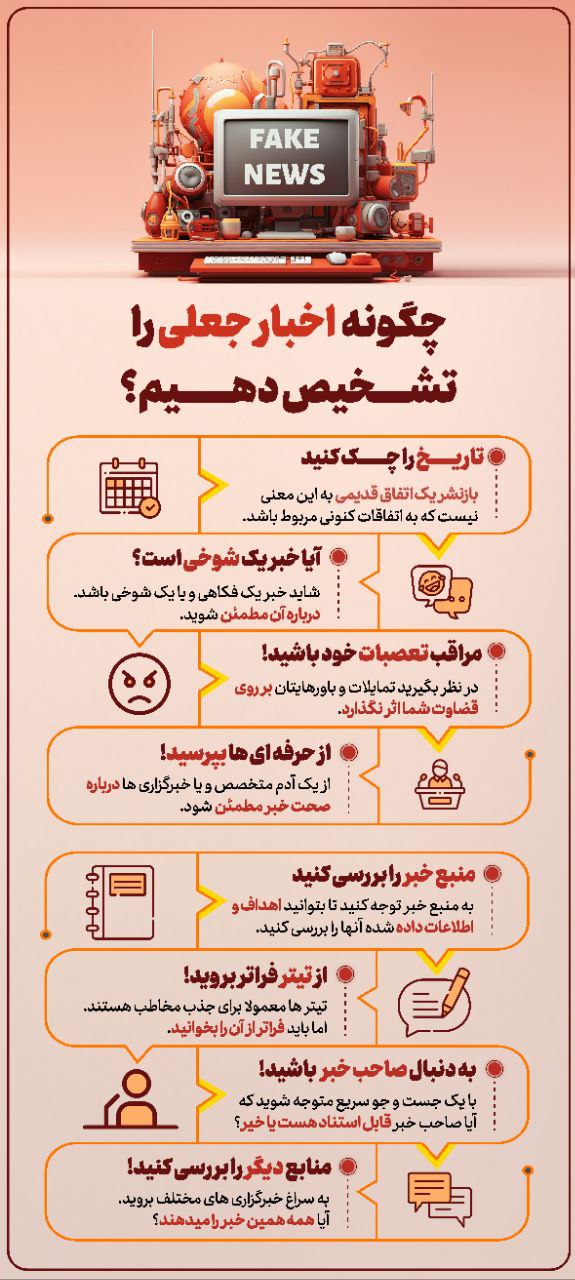 به گزارش نسام به نقل از پایگاه خبری اخبار بناب؛ در این اینفوگرافیک چگونگی تشخیص اخبار جعلی را از صحیح نشان میدهیم.