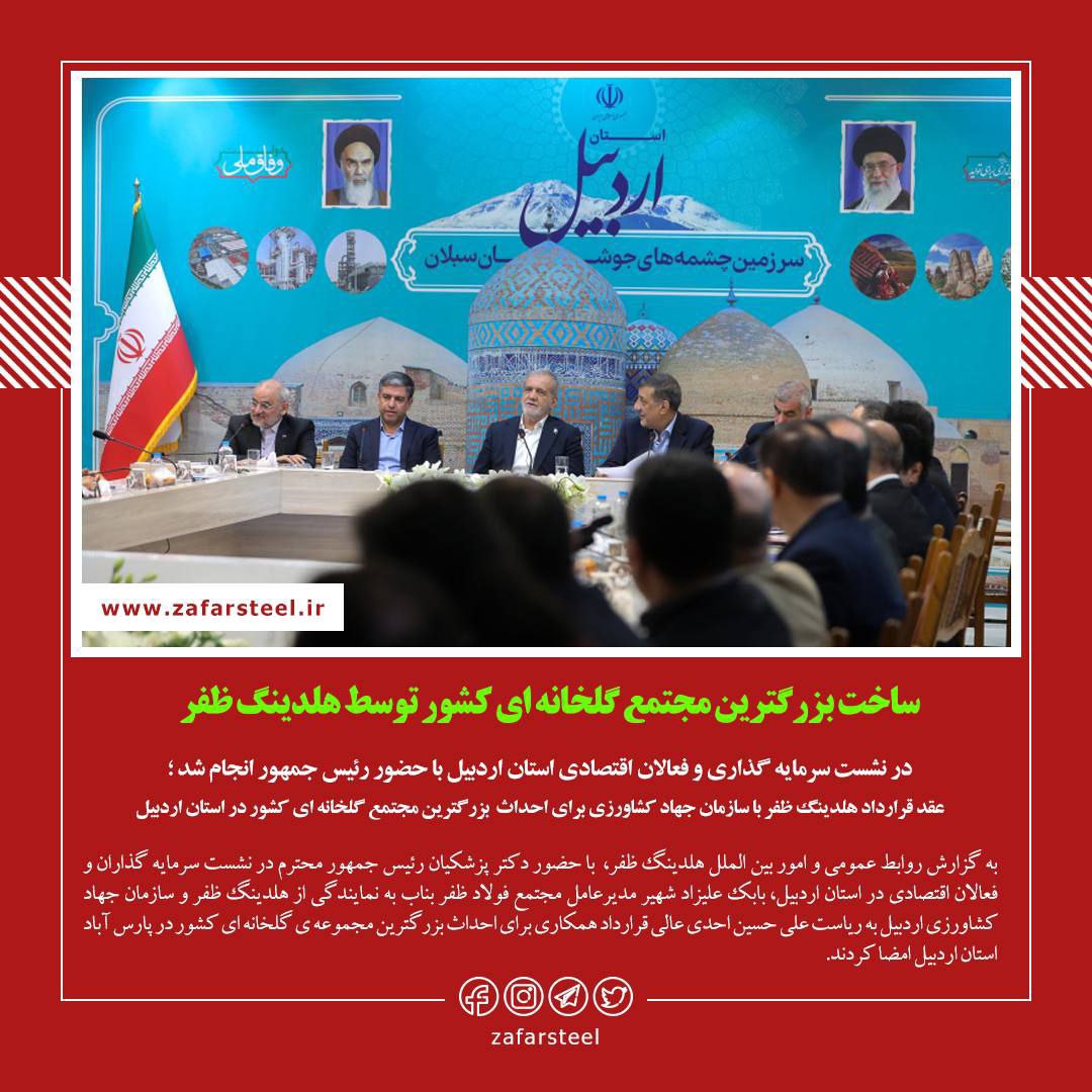 با حضور دکتر پزشکیان رئیس جمهور محترم در نشست سرمایه گذاران و فعالان اقتصادی در استان اردبیل، بابک علیزاد شهیر مدیرعامل مجتمع فولاد ظفر بناب به نمایندگی از هلدینگ ظفر و سازمان جهاد کشاورزی اردبیل به ریاست علی حسین احدی عالی قرارداد همکاری برای احداث بزرگترین مجموعه ی گلخانه ای کشور در پارس آباد استان اردبیل امضا کردند.